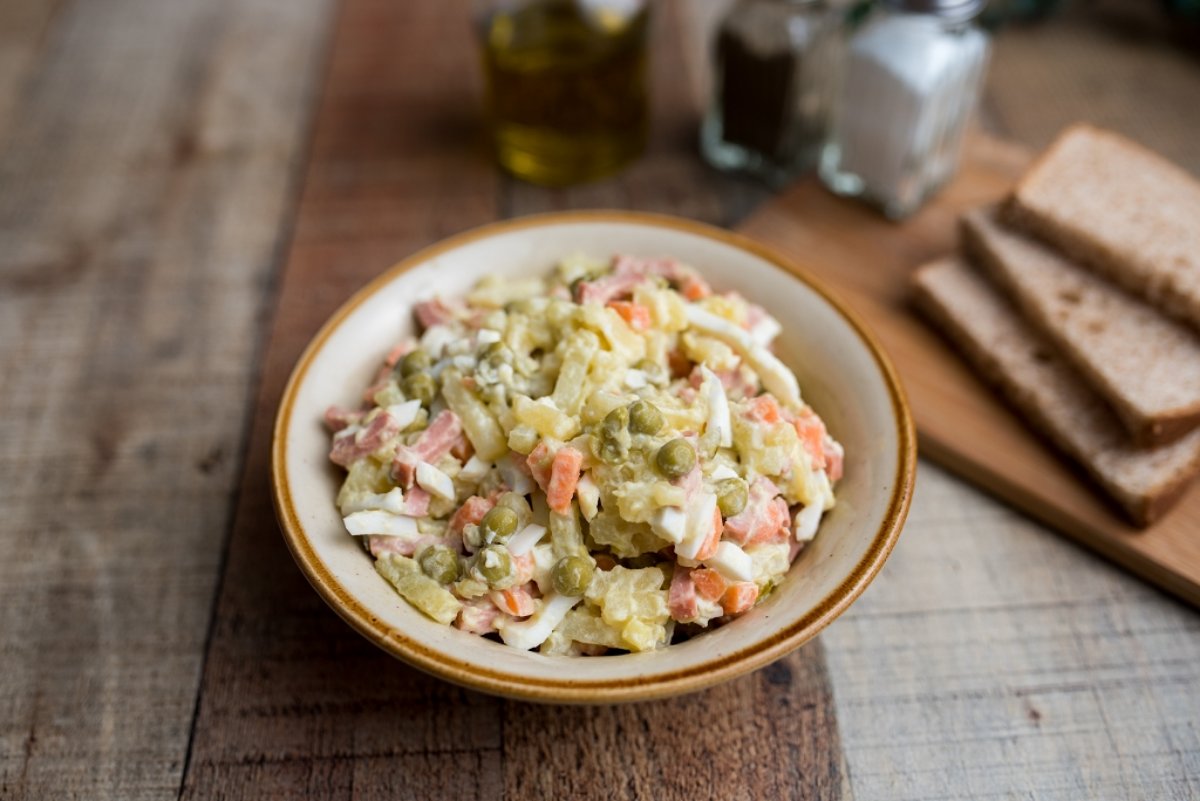 200 g wędliny (np. Polędwicy bez dodatku konserwantów Dobrowolscy), 3 ogórki kiszone, 2 jajka, 1 marchew, 1 mała cebula, 1 mała puszka zielonego groszku, 2 łyżki majonezu, sól i pieprz.