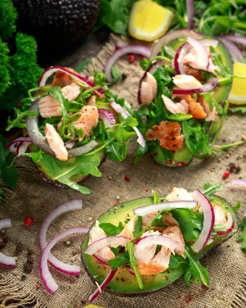 Awokado umyć, przekroić na pół, wydrążyć pestkę. Środek skropić sokiem z cytryny (wówczas nie ściemnieje), wypełnić Rukolą, podzielonym na kawałki wędzonym łososiem oraz pokrojoną w pióra czerwoną cebulą. Oprószyć do smaku solą i świeżo zmielonym kolorowym pieprzem.
