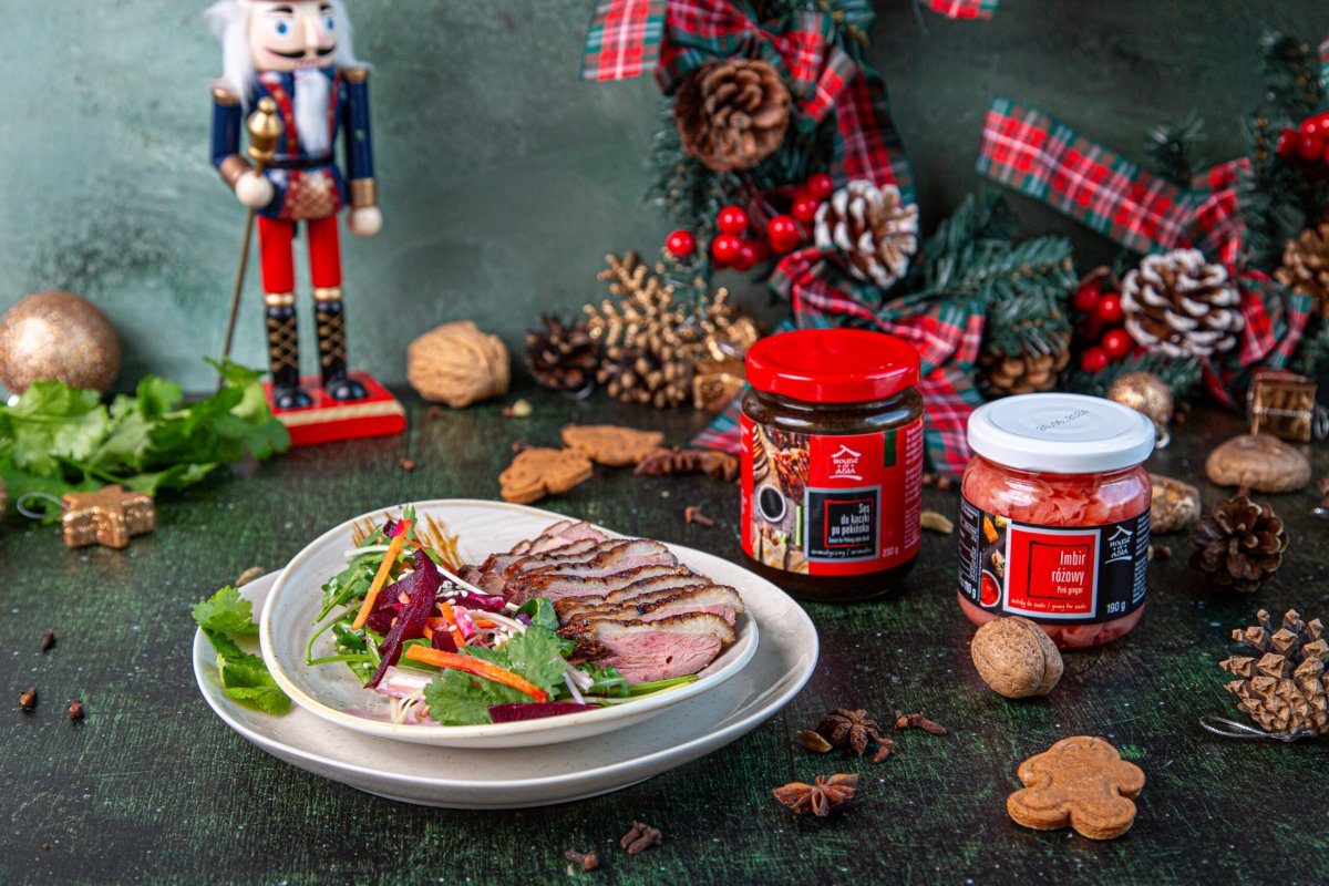 Pierś oczyść z błon i natnij delikatnie w kratkę, tak aby nie poprzecinać mięsa. Zamarynuj w sosie sojowym, soli, pieprzu i ułóż na suchej, zimnej patelni skórą do dołu. Zacznij wytapiać tłuszcz na średnim ogniu przez 7-8 minut, aż skóra stanie się rumiana. Przewróć mięso i obsmaż je z drugiej strony. Następnie przełóż pierś na talerz i posmaruj sosem do kaczki po pekińsku. Wstaw do piekarnika nagrzanego do 180ºC na 6-8 minut (w zależności od jej wielkości). Po tym czasie wyjmij kaczkę i odstaw na kilka minut. Składniki na sałatkę pokrój w kostkę około 0,5 cm, wymieszaj i dopraw do smaku oliwą, miodem i kolendrą. Wystudzoną pierś z kaczki pokrój w plastry. Talerz posmaruj delikatnie sosem do kaczki po pekińsku, ułóż liście botwinki/sałaty, potem sałatkę z burakami, a na wierzch wyłóż plastry kaczki, całość posyp sezamem oraz dymką.