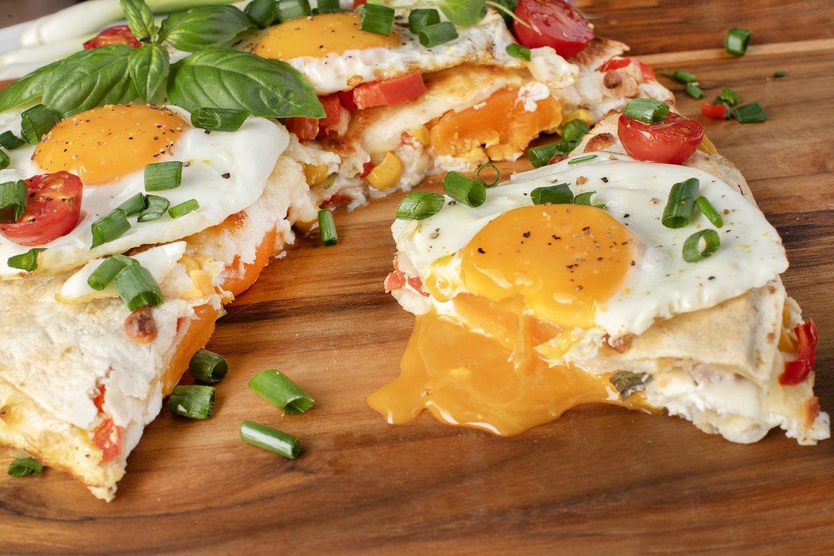 Szynkę kroimy w kostkę i rozmieszczamy na pierwszej warstwie białka, posypując jednocześnie ziołami oraz omijając żółtka, aby się nie rozlały. Kładziemy drugą tortillę i powtarzamy czynności, dodając jeszcze pokrojoną w kostkę paprykę, kukurydzę i mozzarellę. Na wierzch dajemy trzecią warstwę, tym razem pokrywając ją jedynie pokrojoną w plastry mozzarellą.
