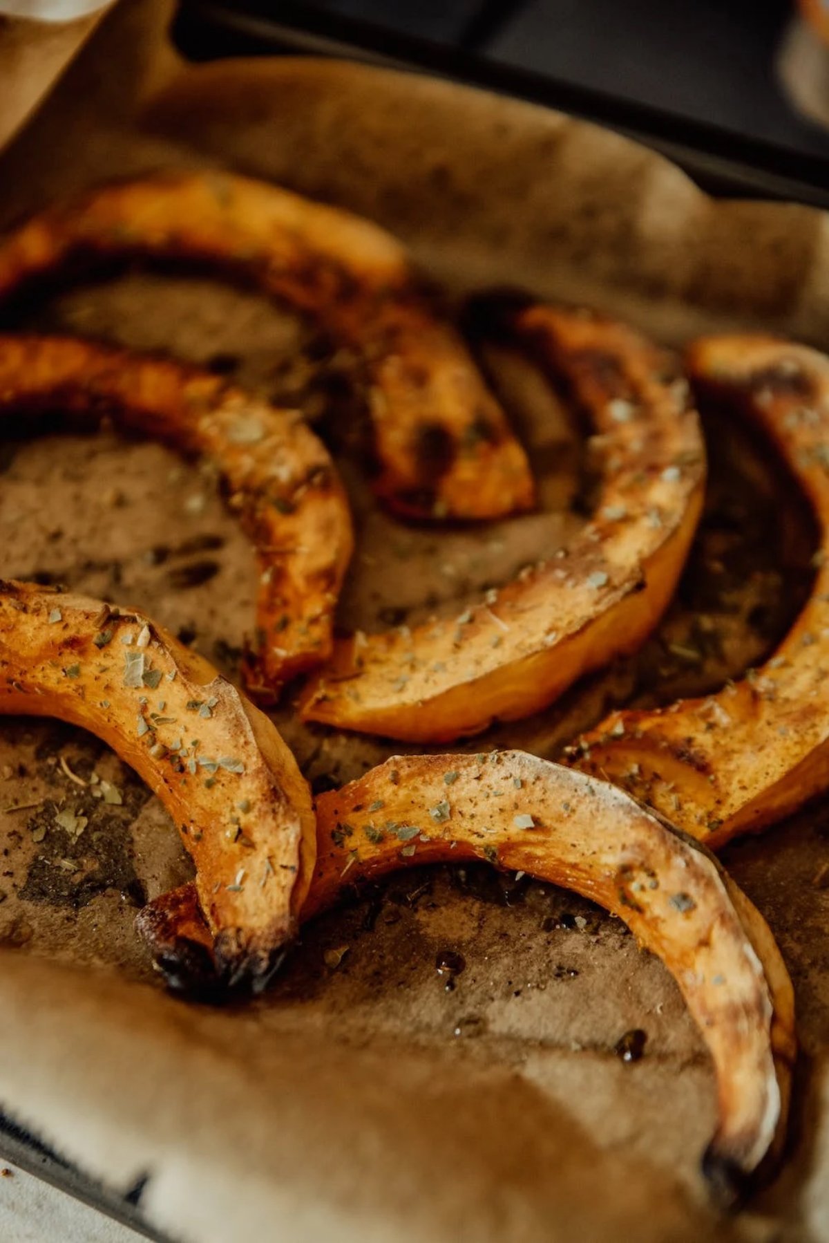 Dynię przekroić na pół i wydrążyć miąższ. Pokroić na kawałki (razem ze skórką) ok. 1 cm. Oliwę wymieszać z wyciśniętym przez praskę czosnkiem. Każdy plaster dokładnie wysmarować oliwą z obydwu stron i natrzeć solą i pieprzem. Umieścić na blasze wyłożonej papierem do pieczenia. Na wierzchu umieścić cienkie plasterki papryczki chili. Piec w temperaturze 200°C przez ok. 25 min. aż się przyrumieni. Posypać startym serem, następnie zapiekać jeszcze 5 minut aż ser się rozpuści.