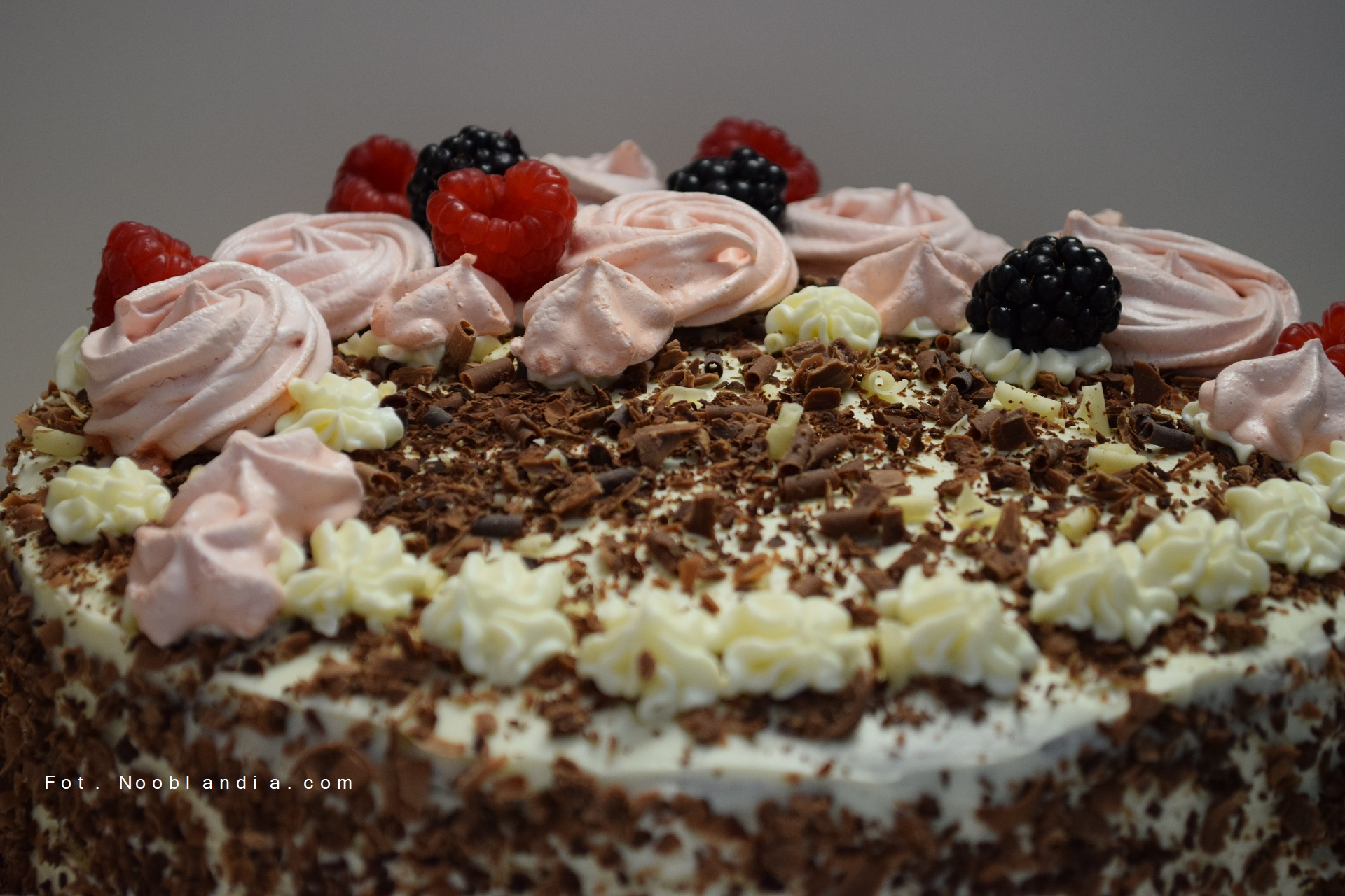 Śmietanę i mascarpone umieścić w wysokiej misce, dodać cukry i zacząć ubijanie. Na początku dobrze jest miksować na niskich obrotach, dopiero jak śmietana przestanie pryskać zwiększyć na największe i miksować do uzyskania gęstego i sztywnego kremu. Krem podzielić na dwie części. Do jednej dodać startą czekoladę i delikatnie wymieszać. A drugą śmietanową otynkujemy tort