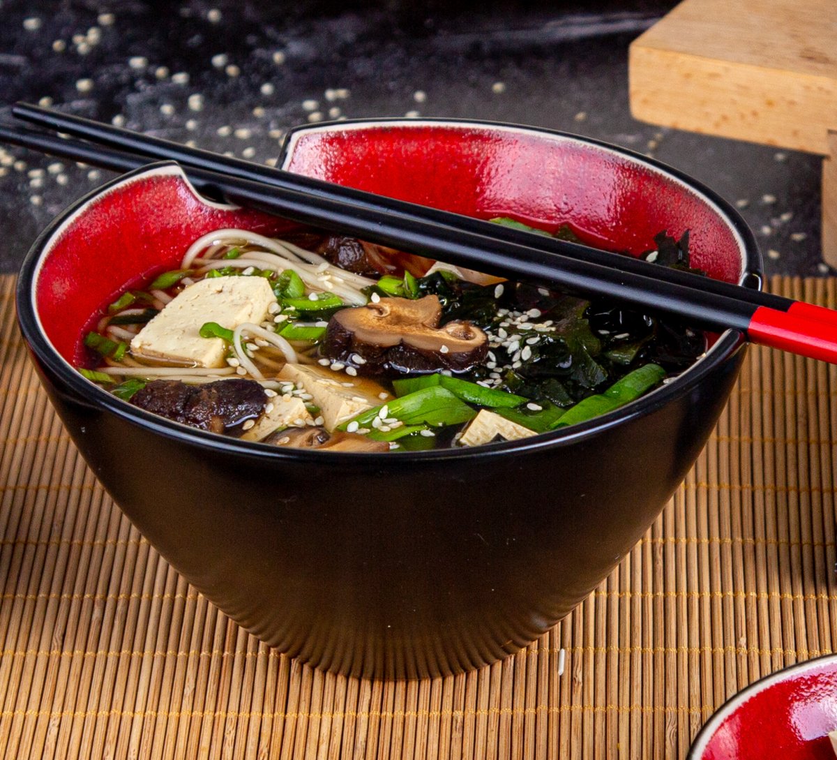 Grzyby shiitake mocz w ciepłej wodzie, aż będą miękkie i pokrój je w plastry. W garnku rozgrzej olej, podsmażaj przez minutę cebulę, pastę z czosnku, imbiru, marchewkę i grzyby. Zalej wszystko wodą, dodaj pastę miso i sos sojowy. Doprowadź do wrzenia i gotuj przez 7 minut. Na koniec wlej olej sezamowy. Makaron przygotuj zgodnie z instrukcją na opakowaniu i wyłóż do misek, zalej zupą miso i udekoruj szczypiorem.