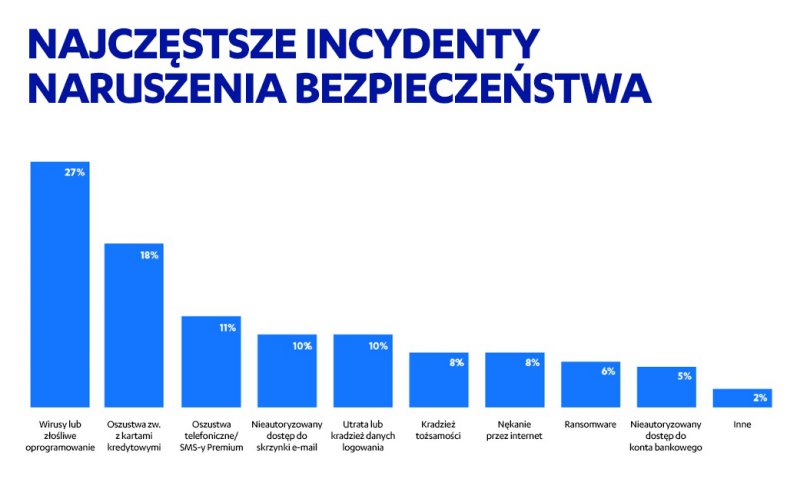 Ponad połowa (51%) internautów ma bliską osobę, która padła ofiarą cyberprzestępcy, a jeden na czterech użytkowników został dotknięty kilkoma formami cyberataku3. Najczęściej spotykanymi zagrożeniami są złośliwe oprogramowanie lub wirusy oraz oszustwa związane z kartami kredytowymi, SMS-ami i połączeniami telefonicznymi. „Tradycyjne” cyberataki są nadal bardziej powszechne niż kradzież tożsamości lub przejęcie konta, jednak liczba tych ostatnich stale rośnie. Koszty oszustw polegających na otwieraniu nowych kont z wykorzystaniem skradzionych danych użytkowników zwiększyły się z 3 mld dolarów w 2017 r. do 3,4 mld w 2018 r4.
