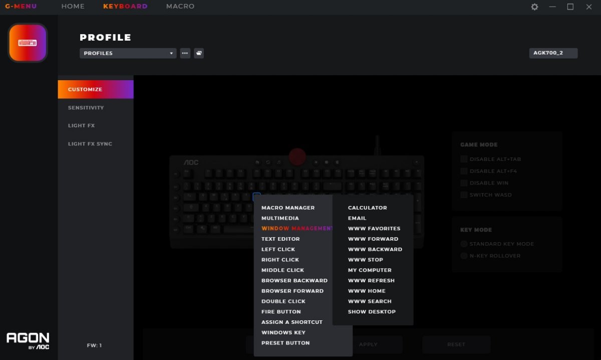 Do wygodnego zarządzania całym zestawem akcesoriów potrzeba intuicyjnego w obsłudze programu, który działa kompleksowo. Takim rozwiązaniem jest G-Menu od AGON by AOC. Pozwala on na sterowanie z jednego miejsca zarówno podświetleniem AOC Light FX, jak i parametrami sprzętu.