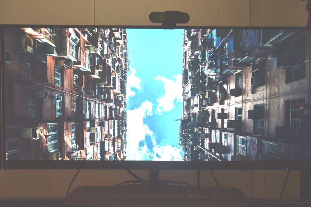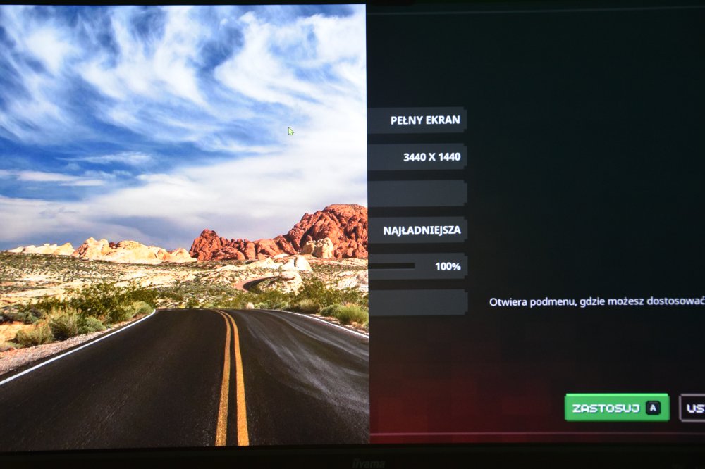 Przede wszystkim różnica jest w wielkości dostępnego pola roboczego, czy też wyświetlania gier. Matryca to IPS, więc o kolory nie ma co się martwić i w odróżnieniu od matryc VA, jest naprawdę kolorowo. Kontrast jest na dobrym poziomie, nie ma co oczekiwać, że będzie tak jak przy matrycach OLED, ale w żaden sposób nie można nic tej matrycy pod tym względem zarzucić. Producent w odróżnieniu od konkurencji oferuje program, gwarancja zero martwych pikseli, a jeśli takowy problem wystąpi to w ciągu 30 dniu od daty zakupu można wymienić model na nowy. Chodź nie jestem pewien czy usługa ta tyczy się wszystkich sklepów czy tylko wybranych. Monitor nie jest wolny od wad występuje w nim tzw. backlight bleedeng, czyli po naszemu, krwawienie, światło, które ma za zadanie podświetlać matrycę prześwietla ją, widoczne jest to na krawędziach. W testowanym przeze mnie modelu taki efekt występuje, ale nie jest to w żaden sposób uciążliwe i widoczne w normalnym użytkowaniu. Na chwilę obecną wiele firm, które oferują ultra szerokie monitory boryka się z tym problemem. Monitor iiyama G-Master GB3461WQSU-B1 posiada wadę fabryczną w postaci migającej prawej połowy monitora. Problem ten występuje tylko podczas zmiany rozdzielczości w grach i to nie zawsze. W testowanym przeze mnie modelu pojawiło się też raz rozdarcie w połowie ekranu. Prawa strona była o pół centymetra niżej niż lewa. Podejrzewam że usterka ta powiązana jest z migotaniem ekranu. Nie wiem czy iiyama ma zamiar w jakimś stopniu to wyeliminować, bo nigdy nie słyszałem aby firma ta wypuszczała aktualizację firmware do monitorów, chodź nie jestem do tego do końca przekonany. Wspomniane migotanie monitora występuje naprawdę rzadko i da się je szybko wyeliminować dzięki ponownej zmianie rozdzielczości lub wyłączeniu i włączeniu monitora. Nigdy się to nie przydarzyło podczas normalnego użytkowania. Co do podświetlenia matrycy, to gołym okiem nie zauważyłem aby któryś z obszarów matrycy był ciemniejszy lub jaśniejszy. Oczywiście pomijając wspomniane krwawienie, które jest tylko widoczne na czarnym ekranie.