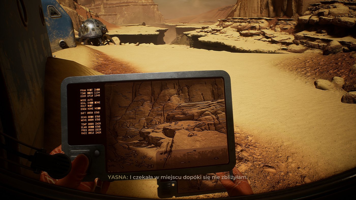 Tak jak na początku napisałem Niezwyciężony to jest trochę taki symulator chodzenia, ale ubrany w ciekawą fabułę oraz da się wyczuć lekkie zaszczucie i niepewność podczas eksploracji planety. Sama fabuła nie pędzi na złamanie karku lecz też nie zanudza. Ot, dostajemy potrzebne informacje i zadaniem gracza jest je wykorzystać podczas eksploracji. To od gracza zależy czy zajrzy w każdy kąt czy też nie. Jedyna różnica jest taka, że każda odnaleziona ważna poszlaka pojawia się w komiksie, który podczas rozgrywki jest na bieżąco aktualizowany. I jeśli czegoś nie odwiedzimy czy też nie sprawdzimy, to nie będzie tego w komiksie. Na szczęście komiks nie ma żadnego znaczenia w historii, bo to tylko streszczenie tego co się do tej pory wydarzyło w grze. Zresztą i tak Novik po czasie dzieli się z Yasną ważnymi informacjami.