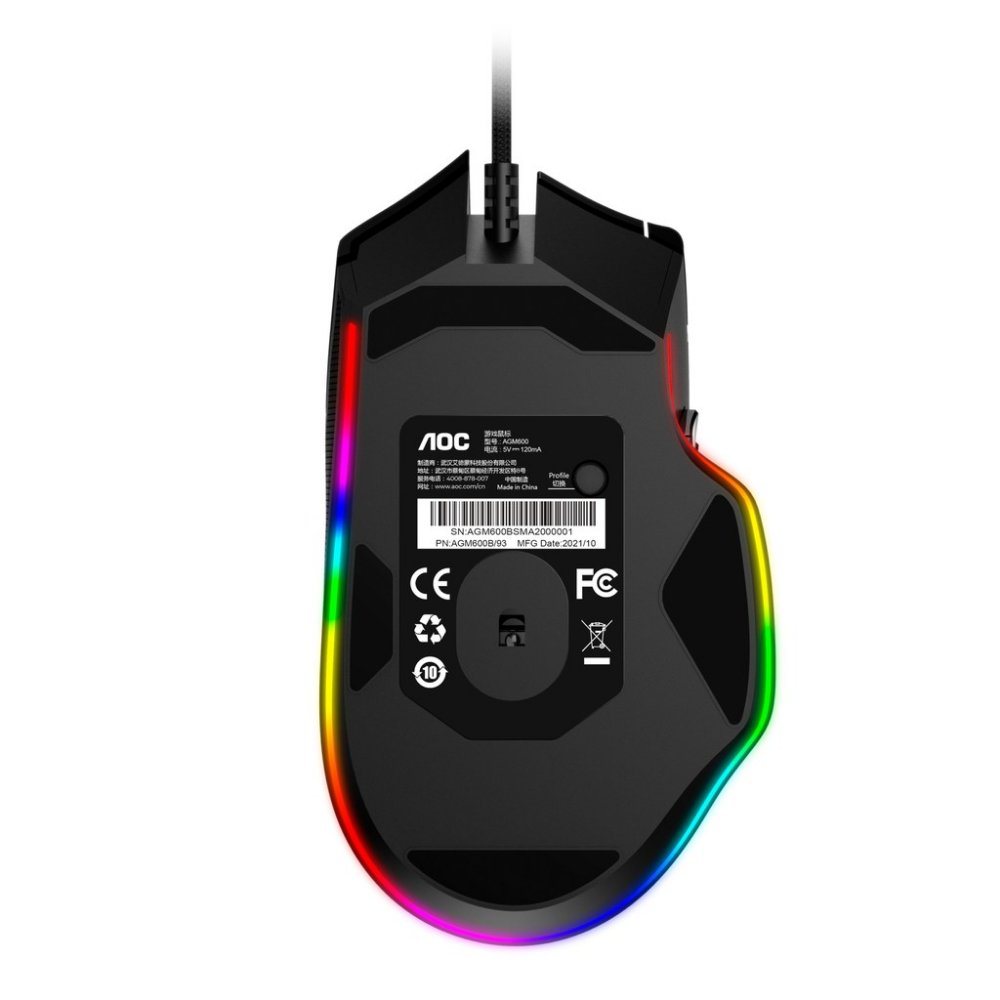 Urządzenie zostało wyposażone we wbudowaną pamięć mieszczącą dwa profile. Przełącza się pomiędzy nimi przyciskiem ulokowanym na spodzie myszy. Edycja profili oraz sterowanie podświetleniem LED RGB odbywa się przy pomocy aplikacji AOC G-Tools, która pozwala też na zmianę ustawień innych urządzeń AOC. Dzięki profilom, po zdefiniowaniu nastawów i zapisaniu ich, mysz można podłączać do innych komputerów bez korzystania z oprogramowania.
