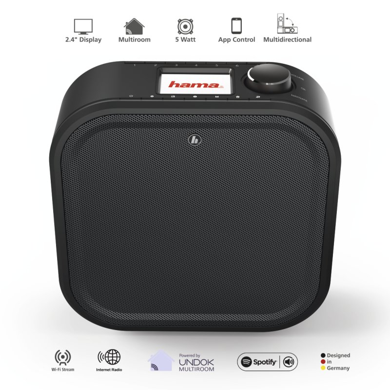 Urządzenie dysponuje głośnikiem o mocy 5 W. Wystarczy je połączyć z Internetem poprzez sieć Wi-Fi lub kabel Ethernet. Nie zabrakło tu też modułu Bluetooth w wersji 4.2, dzięki czemu łatwo zamienić je w designerski głośnik mobilny i strumieniować muzykę ze smartfona, tabletu czy komputera. Informacje można obserwować na kolorowym ekranie TFT o przekątnej 2,4" z menu nawigacji. Jego podświetlenie dostosowuje się do aktualnych warunków oświetleniowych, nie ma więc szans na oślepienie użytkownika w nicy.