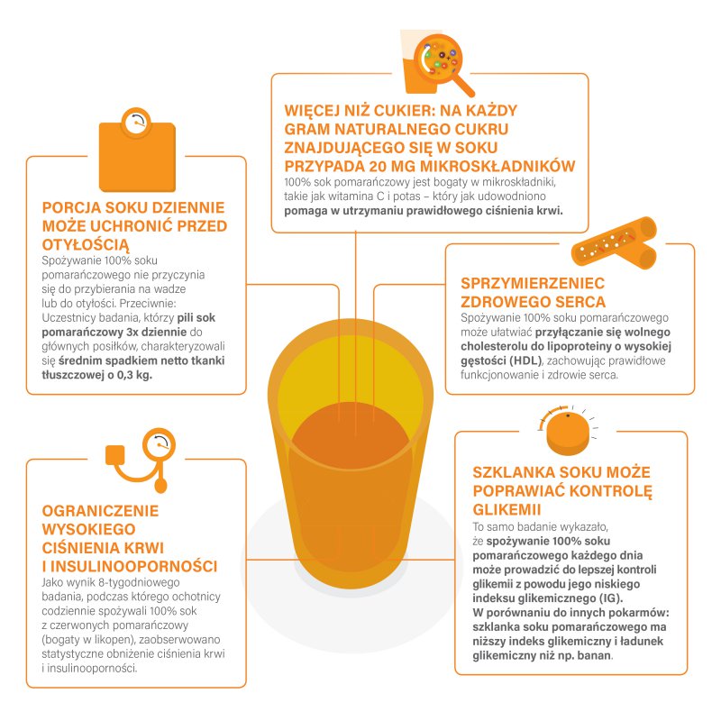 Istnieje przekonanie, że spożywanie 100% soku owocowego przyczynia się do wzrostu masy ciała, jednak nie jest ono poparte żadnymi wynikami badań interwencyjnych o wysokiej jakości. Dla kontrastu, warto przytoczyć wyniki ostatnich badań, które wykazały, że codzienne spożywanie 100% soku owocowego ma neutralny bądź nawet pozytywny wpływ na masę ciała. We wspomnianym badaniu[1] udział wzięło 78 osób otyłych, które zostały przydzielone do 2 grup. W grupie badanej przez 12 tygodni stosowano dietę redukcyjną wraz z 500 ml soku pomarańczowego a w grupie kontrolnej stosowano standardową dietę niskokaloryczną bez soku. W niniejszym badaniu stwierdzono, że dodanie soku pomarańczowego do diety odchudzającej nie wpływa na utratę masy ciała wywołaną przez dietę, dodatkowo nie zwiększa poziomu glukozy w surowicy krwi, za to poprawia wrażliwość na insulinę i markery stanu zapalnego. W grupie badanej zwiększyło się również spożycie witaminy C i folianów odpowiednio o 62% i 39%, co nie miało miejsca w grupie kontrolnej. Zatem umiarkowane spożycie soku pomarańczowego zapewnia korzyści związane z interwencją odchudzającą i nie ma niekorzystnego wpływu na masę ciała i parametry metaboliczne u otyłych pacjentów.