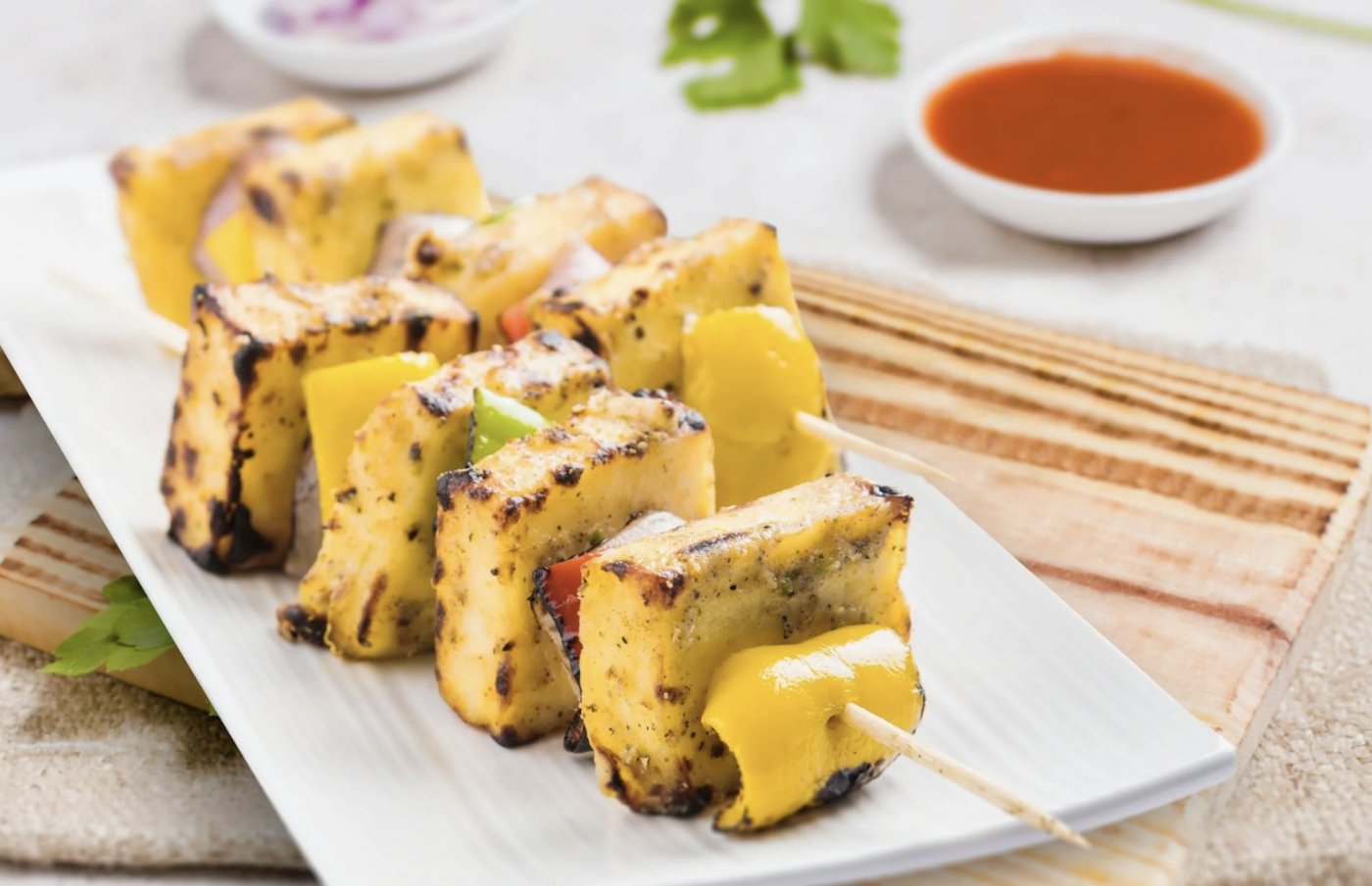Tak przygotowane kawałki możesz grillować solo albo stworzyć z nich kolorowe szaszłyki z warzywami. Świetnie sprawdzą się grillowana papryka, pieczarki, cebula czy cukinia.