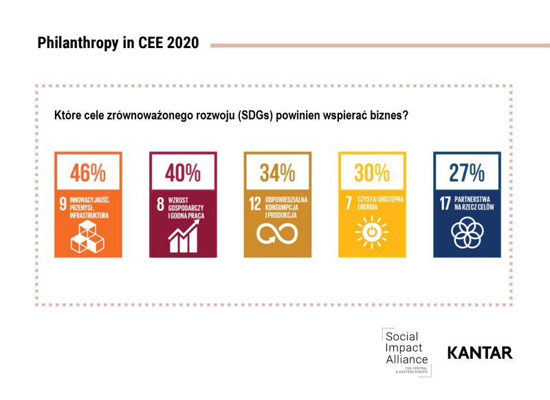 Dodajmy, że według mieszkańców krajów Europy Środkowo-Wschodniej, osiąganie Celów Zrównoważonego Rozwoju (SDGs) powinno być wspierane przede wszystkim przez administrację publiczną. Jednak zapytani o to, kto faktycznie je realizuje, respondenci zdecydowanie rzadziej wskazywali rządy, doceniając za to rolę organizacji społecznych, biznesu i darczyńców indywidualnych. Jak mówi Łukasz Kolano, Co-Chair UNGC Regional Network Council Chair (Eastern Europe and Middle East), Executive Director Global Compact Network Poland: - Na drodze do sukcesu kluczowe znaczenie ma angażowanie kapitału prywatnego, pochodzącego od osób indywidualnych i biznesu. Istotne jest wielkostronne forum dialogu tak, aby pomagać biznesowi i społeczeństwu identyfikować problemy oraz wskazywać ścieżki do ich rozwiązywania. Przeznaczane przez otoczenie środki muszą efektywnie pracować na rzecz zmian społecznych, szczególnie że zasoby, którymi dysponujemy, zawsze będą ograniczone w stosunku do wielości wyzwań, z którymi mierzy się świat. Dlatego ważne jest przejście od pomagania reaktywnego, bazującego na emocjach, do filantropii strategicznej, której towarzyszy maksymalizacja trwałego, długoterminowego wpływu społecznego.