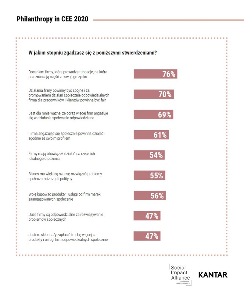 Trwający kryzys covidowy uświadomił Polakom, jak ważne jest zaangażowanie filantropijne społeczeństwa i biznesu – wynika z raportu „Filantropia w CEE 2020”, w którym po raz pierwszy oceniono potencjał filantropijny Polski i innych krajów Europy Środkowo-Wschodniej. W badaniu 39% naszych rodaków potwierdziło, że pandemia zmieniła ich zachowania w obszarze dobroczynności – dziś liczba pomagających Polaków wynosi 51%. Jednocześnie zwiększyły się oczekiwania względem firm - 56% z nas chce kupować produkty marek społecznie odpowiedzialnych, a 47% - wyraża gotowość zapłacenia za nie wyższej ceny.