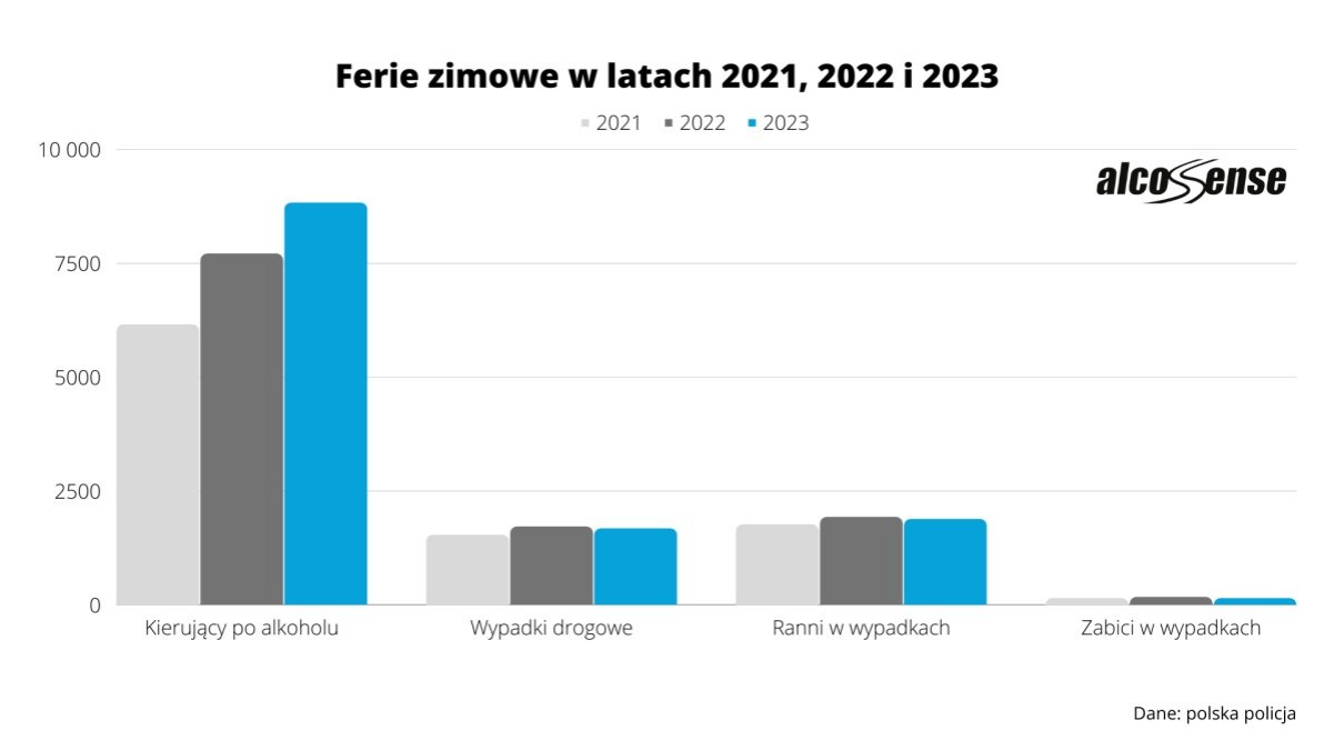 Przez 41 dni ferii służby zarejestrowały 1676 wypadków drogowych, w których zginęły 143 osoby, a 1881 zostały ranne. Wszystkie te statystyki zmalały względem przerwy zimowej w 2022 roku. Niestety, pijanych kierowców na drogach było 8830, o 1119 więcej niż w ubiegłym roku. Względem ferii w 2021 r., to wzrost aż o 43%. Zatrzymano wtedy 6157 jeżdżących po alkoholu.