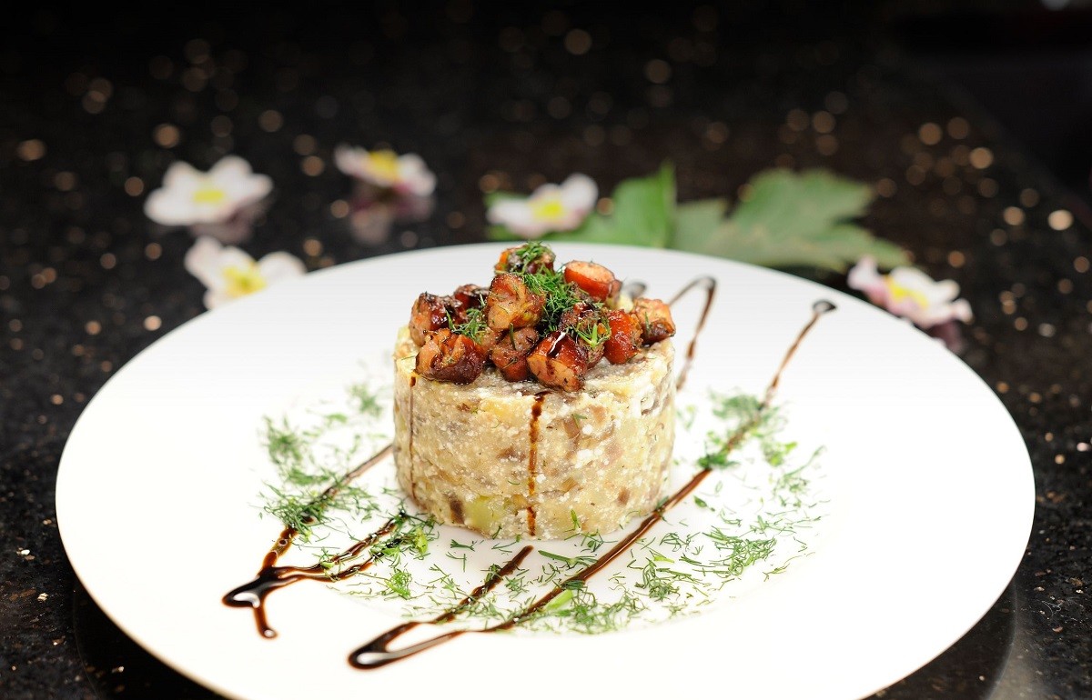 Na koniec możemy uformować na talerzu walec z tak przygotowanych ziemniaków, położyć na wierzchu usmażone kiełbaski, posypać koperkiem i polać odrobiną sosu balsamicznego.