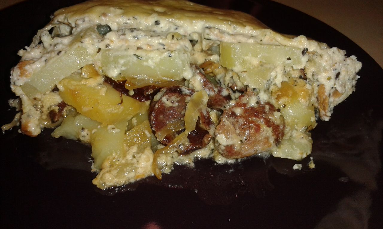 W naczyniu żaroodpornym wyłożyć połowę ziemniaków, następnie kiełbasę, cebulę i pozostałe ziemniaki, na wierzch wylać sos i posypać startym serem.