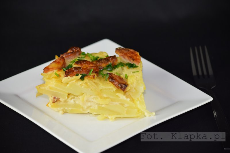 Pyszna zapiekanka ziemniaczana z sosem beszamelowym:) Ma proste składniki, jest tania, ale na czas zapiekania niestety trzeba uzbroić się w cierpliwość.