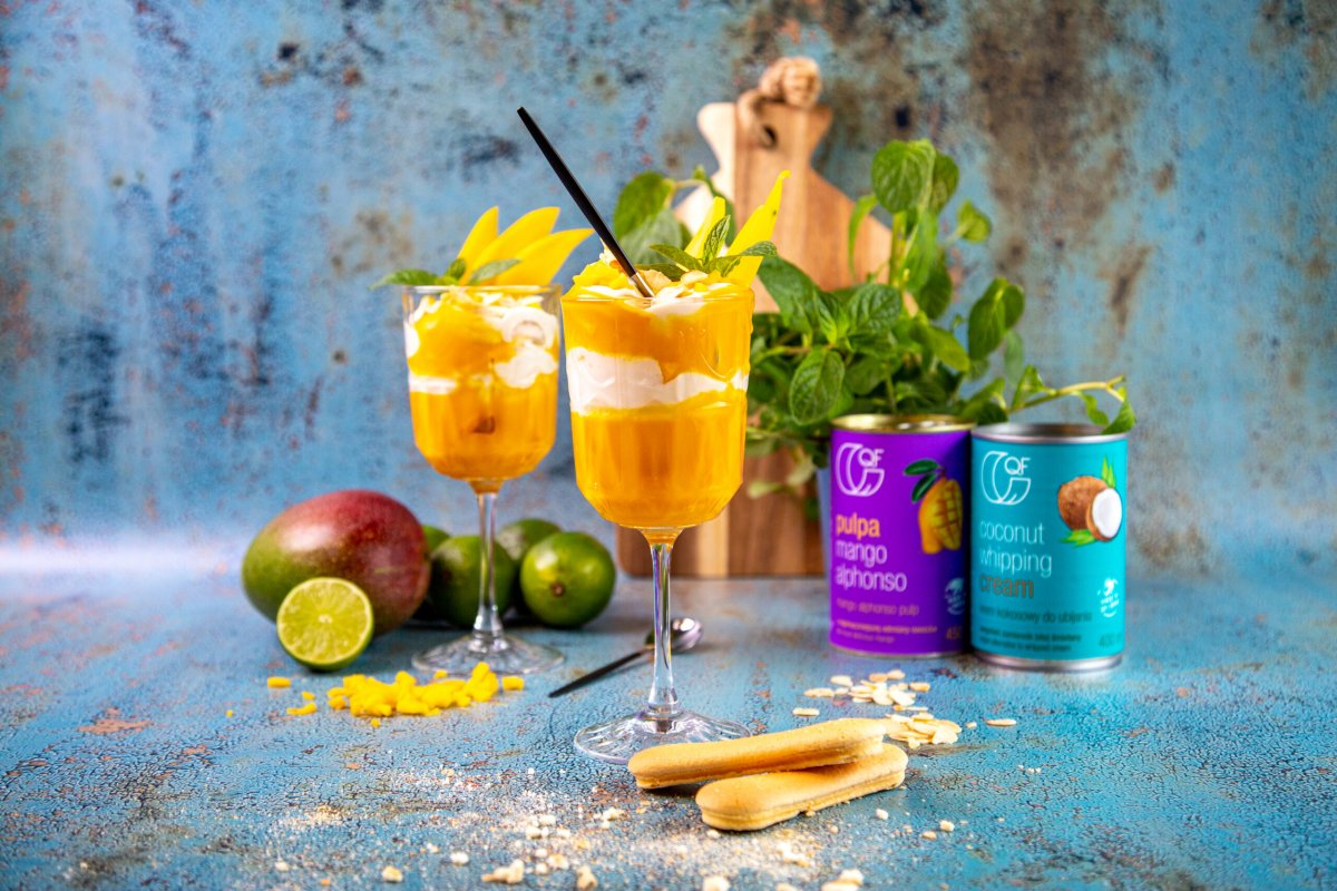 Krem kokosowy ubij z dodatkiem cukru pudru. Na suchej patelni upraż płatki migdałów i odstaw do ostygnięcia. Świeże mango obierz i pokrój na cienkie plasterki - posłużą do dekoracji. Przygotuj 6 małych pucharków. Do każdego włóż po ok. 1 – 2 połamanych na kawałki biszkoptów i skrop je sokiem z limonki. Następnie wlej warstwę pulpy z mango i warstwę ubitego kremu kokosowego. Powtórz czynność zaczynając od biszkoptów i kończąc na warstwie kremu. Każdy deser udekoruj uprażonymi płatkami migdałów, kawałkami świeżego mango i listkiem mięty.