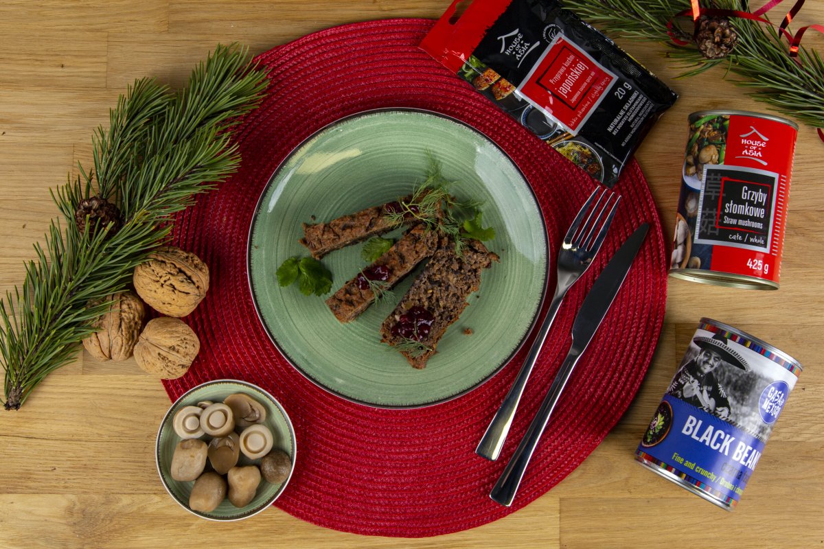 Panko zmiksuj w blenderze z 4 suszonymi grzybami. Na oleju podsmaż cebule, pastę z czosnku i kiszoną kapustę, podlej wodą i duś przez około 10 minut, aż woda całkowicie odparuje. Pozostałe grzyby zalej zimną wodą i gotuj do miękkości przez 30 minut, odcedź, pokrój w drobną kostkę, dodaj do kapusty i smaż całość kilka minut. Fasolę zmiksuj z jajkami i odrobiną wody, dodaj do kapusty z grzybami, wymieszaj, na końcu dopraw gałką muszkatołową, majerankiem oraz solą i pieprzem. Formę do pieczenia wysmaruj masłem i oprósz panierką panko z grzybami. Przygotowaną masę przełóż do formy. Piecz 40-50 minut w piekarniku nagrzanym do 180°C (ustawionym na termoobieg). Po upieczeniu zostaw w formie do ostudzenia. Pasztet podawaj na ciepło lub zimno z sosami lub warzywnymi konfiturami.