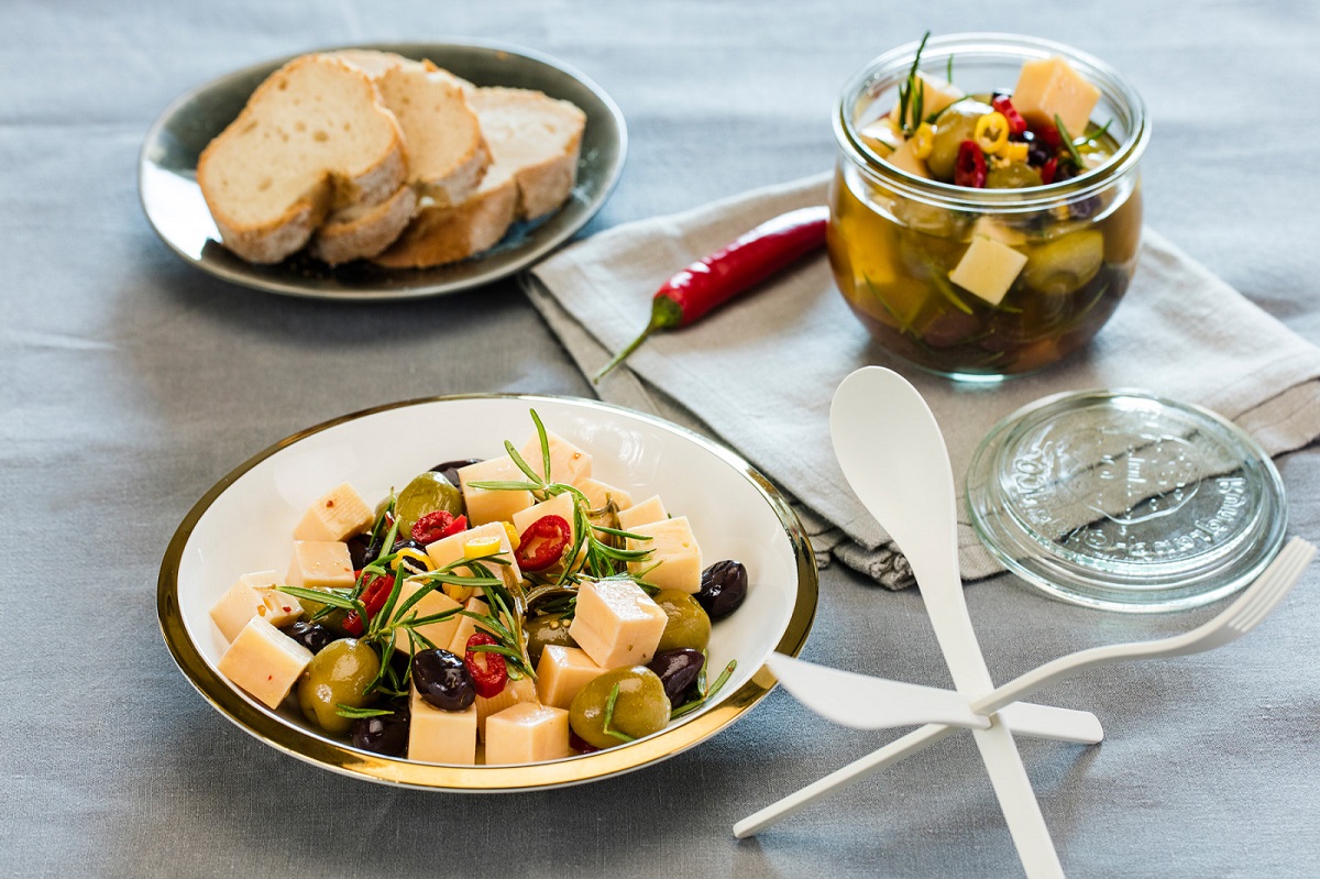 Ser pokroić w dwucentymetrowe kostki, dodać oliwki, pokrojoną w krążki paprykę i igiełki rozmarynu. Wszystkie składniki wymieszać, przełożyć do słoika i zalać olejem. Odstawić na parę dni, żeby rozmaryn i papryka uwolniły swój smak.