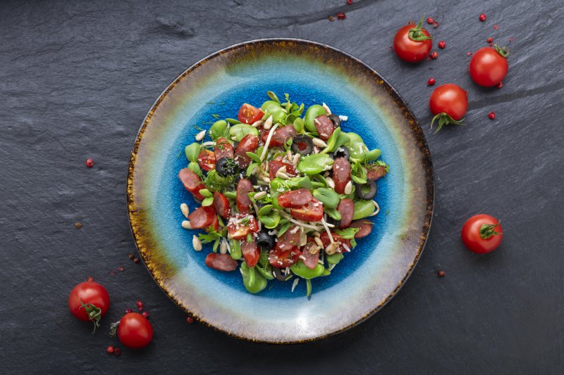 W garnku zagotować delikatnie osoloną wodę. Wrzucić bób, gotować go do miękkości. Następnie odsączyć i obrać. W międzyczasie pomidorki koktajlowe pokroić na połówki, zaś pokrojone w plasterki kabanosy podsmażyć na suchej patelni. Koperek i pietruszkę drobno posiekać, ser zetrzeć na tarce. Na suchej patelni uprażyć pestki słonecznika. Oliwki w krążkach odsączyć z zalewy. Wszystkie składniki połączyć i posypać kiełkami słonecznika. Całość polać przygotowanym wcześniej dressingiem.