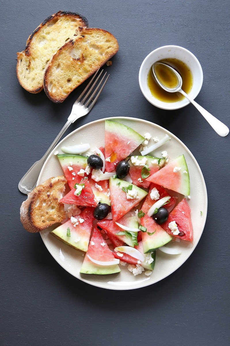 Arbuza pokroić w trójkątne kawałki i ułożyć na talerzu. Cebulę pokroić w piórka, ułożyć na cząstkach arbuza razem z oliwkami. Ser feta rozdrobnić i posypać nim sałatkę. Listki mięty drobno posiekać. Dodać oliwę, sok z cytryny i pieprz. Dokładnie wymieszać. Dressingiem polać sałatkę, ozdobić posiekanym szczypiorkiem. Bagietkę do odpieku pokroić na kawałki, skropić oliwą z oliwek. Zapiekać w piekarniku kilka minut na złoty kolor. Podawać jako dodatek do sałatki arbuzowej.