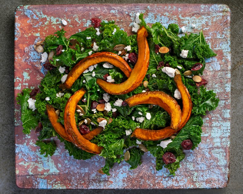 Piekarnik nagrzać do temperatury 200°C. Dynię rozkroić na pół i wybrać pestki. Następnie pokroić ją na tzw. łódeczki. Piec ok. 25-30 min z termoobiegiem, aż brzegi dyni będą delikatnie przypieczone. Jarmuż zblanszować - wrzucić do wrzątku i gotować 2 min, po wyjęciu przepłukać zimną wodą. Wymieszać miód, oliwę, sok z cytryny i przyprawy. Gotowym dressingiem polać jarmuż i wyłożyć na talerz wraz z upieczoną dynią. Całość posypać uprażonymi na suchej patelni pestkami dyni, pokruszonym serem feta i żurawiną.