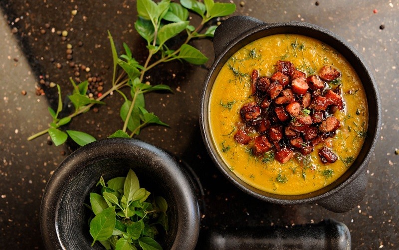 Odmierzyć około 0,5 l rosołu, dodać warzywa z rosołu i mięso, pokrojoną w kostkę dynię, bazylię, lubczyk, czosnek, pieprz i miksować to całe towarzystwo, aż do uzyskania szorstkiej konsystencji. Szorstkiej nie gładkiej, ma być po śląsku!