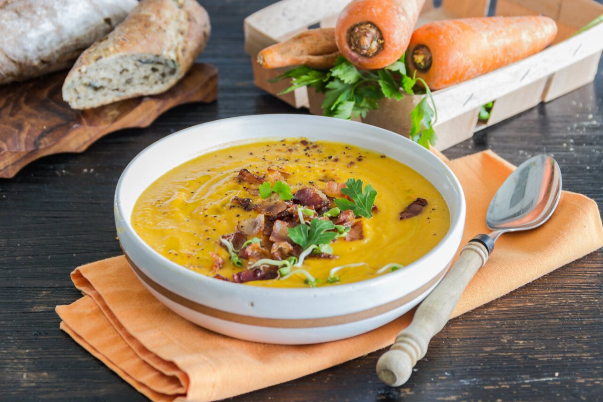 Pokrój boczek na kawałki i ułóż je na blasze wyłożonej papierem do pieczenia. Rozgrzej piekarnik do 200 stopni C. i piecz przez około 15-20 minut lub aż stanie się chrupiący. W międzyczasie obierz dynię, usuń pestki i pokrój na małe kawałki. W dużym garnku rozgrzej masło i dodaj posiekaną cebulę. Smaż na małym ogniu przez kilka minut do zeszklenia. Dodaj posiekany czosnek, marchewkę i ziemniaka. Smaż przez kilka minut, mieszając od czasu do czasu.