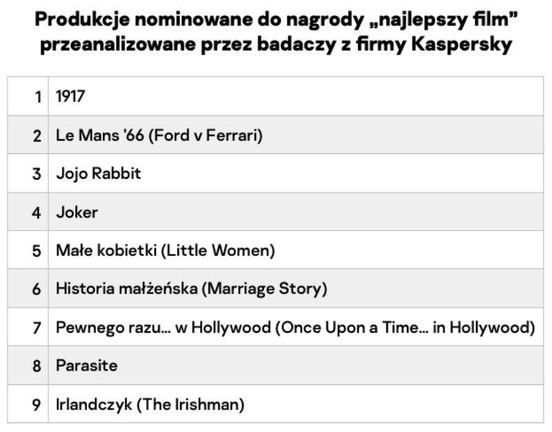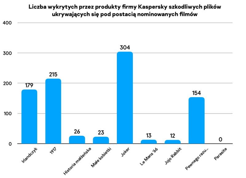 Szkodliwe pliki rozprzestrzeniane w internecie poprzez podszywanie się pod kopie nominowanych do Oscara filmów wskazują również na stopień zainteresowania, jakim cieszą się nominowane tytuły. Badacze z firmy Kaspersky porównali szkodliwą aktywność wykorzystującą jako przykrywkę nominowane filmy w okresie czterech pierwszych tygodni od publicznej premiery filmu. Najpopularniejszym filmem wśród cyberprzestępców jest „Joker” – czarny charakter z Gotham został wykorzystany w nazwie 304 szkodliwych plików. Na drugim miejscu w rankingu uplasował się film „1917” (215 szkodliwych plików), natomiast na trzecim „Irlandczyk” (179 plików). W przypadku koreańskiej produkcji „Parasite” nie odnotowano żadnej szkodliwej aktywności.