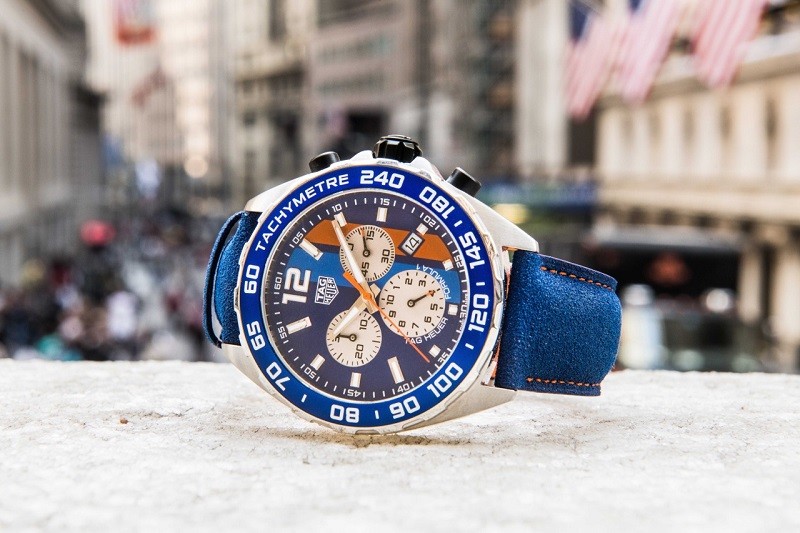 TAG Heuer Formula 1 Gulf Special Edition to zegarek wykonany z wysokogatunkowej stali. W środku koperty o średnicy 43mm skrywa się szwajcarski mechanizm kwarcowy. Bezel czasomierza wykonano z aluminium, a na tyle koperty znalazło się logo Gulfa. Pod szafirowym szkłem umieszczono niebieską tarczę, którą przecinają dwa paski: błękitny i pomarańczowy. Tam też znajdują się trzy mniejsze tarcze chronografu, wskazujące minuty, sekundy i setne sekundy. Całość umieszczono na niebieskim pasku, przeszywanym stylową, pomarańczową nicią. Cena tego specjalnego czasomierza sugerowana przez producenta to 6490 zł.