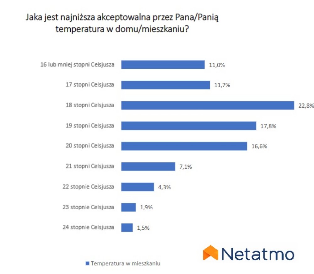 Badanie Netatmo pokazało, że dla blisko ¼ Polaków najniższa akceptowalna temperatura w pomieszczeniach wynosi 18 stopni Celsjusza. Według 18% respondentów w domu lub mieszkaniu powinno być minimum 19 stopni, a dla 17% – 20 stopni. Polacy są więc gotowi do obniżania temperatury w pomieszczeniach od 1 do nawet 4 stopni Celsjusza.