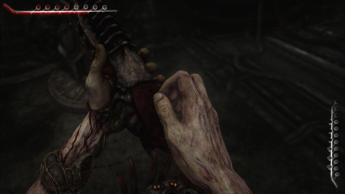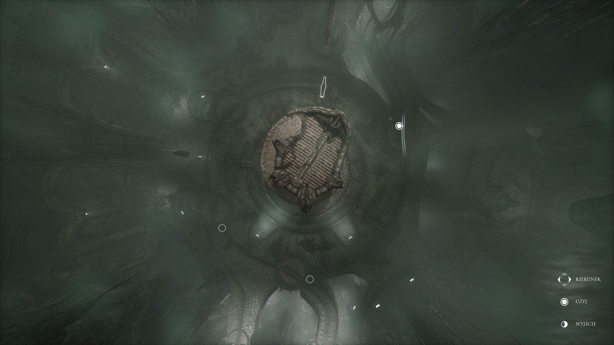 I to właśnie nieagresywne rozwiązania sprawiają, że gra nabiera jeszcze lepszego klimatu. Przez cała rozgrywkę nie czułem strachu. Przy Scorn nie czułem absolutnie, że gram w horror. Za to bardzo odczuwałem zaszczucie i miałem dziwne wrażenie, że coś jest z tym światem bardzo nie tak. I faktycznie po krótkim prologu okazało się, że coś co w nim wykonywałem nie udało się. Urządzenie, które do czegoś służyło wybuchło. Nie wiem ile czasu upłynęło od tej nieszczęsnej awarii, ale świat jaki zastałem po powrocie wyglądał jakby minęły wieki. A stąd to wiem, bo kiedy po raz kolejny pojawiłem się w miejscach, które wcześniej odwiedzałem wszystko było zniszczone i pokryte pyłem. Gra wciąż nie wyjaśniała i nie dawała żadnych wskazówek, nadal nie znałem swojego celu podróży i co mam po drodze wykonać. Poprzednia misja zakończyła się niepowodzeniem, co teraz? Serię takich pytań można sobie zadawać aż do samego końca gry. Bo Scorn to podróż, w której to ty graczu masz się dowiedzieć dlaczego i po co to wszystko robisz.