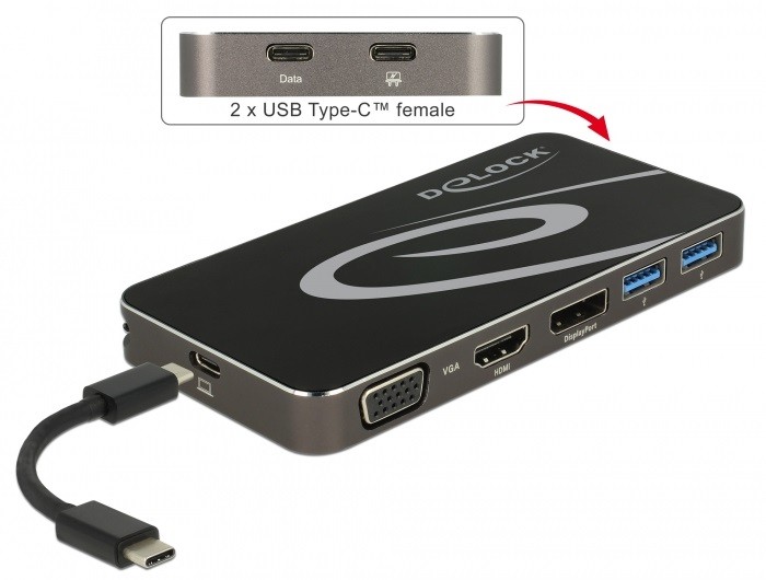 Dzięki temu, że USB 3.1 (gen. 2) kompatybilny z Thunderbolt 3 posiada bardzo wysoką przepustowość, może zastąpić nie jeden, a wiele portów naraz. Z tej właściwości skorzystała firma Delock tworząc swój produkt o symbolu 87722. Po podłączeniu go do komputera za pomocą kabla USB zyskujemy dostęp do wszystkich gniazd urządzenia. Tych jest niemało. Obecność portów USB nie powinna dziwić, ale już HDMI, DisplayPort oraz D-Sub (VGA) mogą być dla części użytkowników zaskoczeniem.